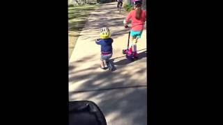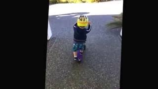 from yesterday riding a his big Sisters three wheel scooter to today having a go on his own two wheel scooter.
